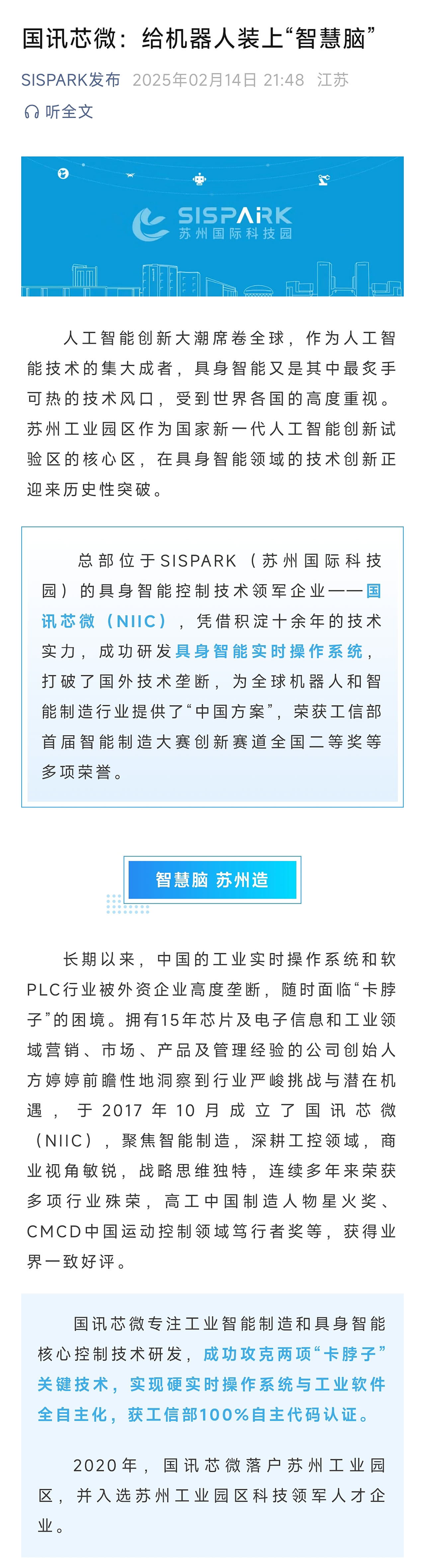 “SISPARK发布”聚焦国讯芯微,解锁具身智能新密码在具身智能蓬勃发展的当下,国讯芯微正以创新之力引领行业变革。很荣幸获得苏州国际科技园 “SISPARK 发布” 的关注,此次发布的文章,深度剖析了我们在具身智能领域的探索与突破。